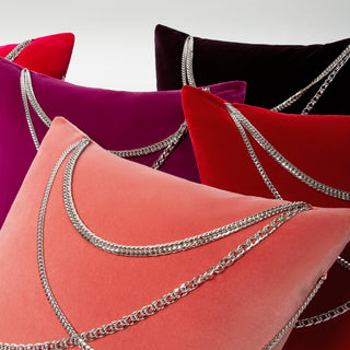Unexpected and elegant. A soft sculpture with attitude, the BIANCA features asymmetrically draped, jewelry-grade chains—channeling both Coco Chanel’s elegance and the swagger of '80s hip-hop. This velvet cushion is available in square and lumbar shapes.